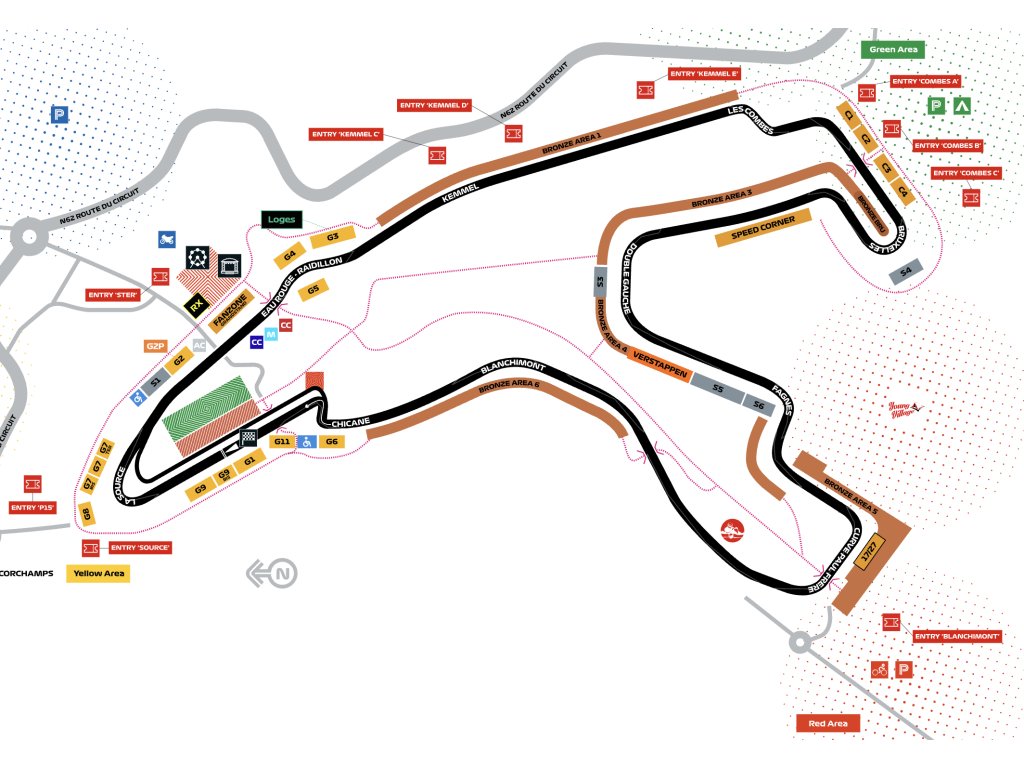 KRYTÁ TRIBUNA: Gold 1 Pit, Gold 2 GP2, Gold 3 Eau Rouge, Gold 6 Chicane, Gold 7 Source, Gold 8 Source-Start, Gold 9 Pole-Position, Gold 11 Premium Chicane, Silver 3 Double Gauche, Silver 4 Bruxelles.