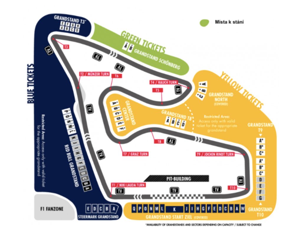 DALŠÍ INFORMACE: Všechny tribuny k sezení mají číslovaná místa. Všechny tribuny i na Místa k stání mají výhled na obří obrazovku. // Mapka okruhu je orientační a uvádí přibližné rozmístění tribun na okruhu. Případná změna termínu akce neopravňuje ke stornu objednávky.